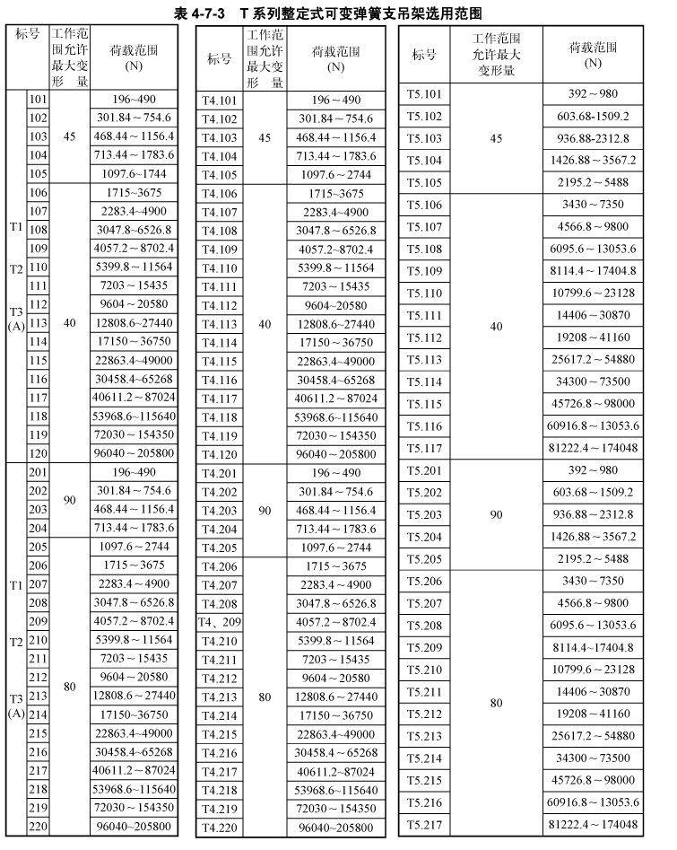 T系列整定式可变弹簧支吊架选用范围见表4-7-3。